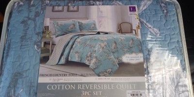 [This review was collected as part of a promotion.] I really love my new Lush Décor - French Country Cotton Reversible 3-piece Quilt. It looks so pretty spread out on my bed, I love the black/white imprint designs of french country which blend very nice with the quilt's light blue color, and being able to have the option to reverse the quilt, and and see such nice black strips designs on the other side is wonderful. The quilt is light, not heavy and it comes with a set of matching, very well stitched pillow covers. Love it!