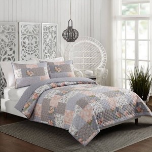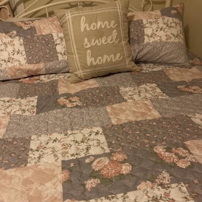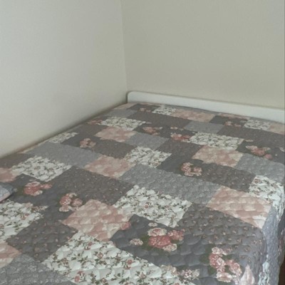 Add a romantic English garden ambience to your bedroom with the La Flor quilt design. This pretty, faux pieced quilt is a mix of lovely, vintage, wallpaper floral prints all beautifully blended with a faux horizontal piecing feel creating a timeless heirloom masterpiece. Printed on 100% brushed polyester for easy care and reverses to solid soft gray. All four sides of the quilt and sham are secured with a gray binding for extra quality and value.