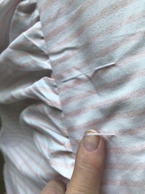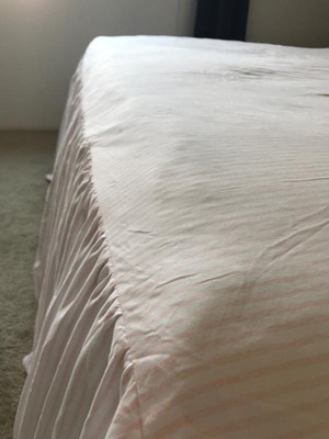 This is a cute bedspread,, but be prepared for wrinkles when unpacking. I washed it on gentle and dry on low heat but was still wrinkled, so I ended up ironing it on a low setting and they came out well. Other than the wrinkles haven't had any issue seems to be made well. Originally I purchased the Amazon version which was cotton, & $200 for the spread alone.... I loved the material, but the ticking on it was grey and I wanted the neutral stripes,,, these stripes aren't as detailed but they're the color I want so that's why I chose the target one. The drop on the sides could be a little longer for the puddling but my mattress topper makes my bed a bit higher, so it almost hits the floor Overall pleased with it The price is fair too.