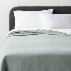 We love this coverlet! I’m a hot sleeper so this has been perfect for summer fall temperatures. It’s a gorgeous shade of green, it’s soft, and has held up to my kids and dog playing on it without any picks or tears. Great quality!