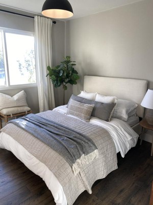 Add a rich look and elegant style to your sleeping space with the Olivia Upholstered Platform Bed from Threshold™. This platform bed is designed with a pine wood frame and makes a perfect pick to revamp your existing bedroom or set up a new one. Elegantly upholstered, this linen bed helps you stay comfy whether you're sleeping, reading your favorite book or watching TV in bed.
