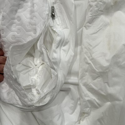 This mattress pad had long strings all over it they caught in zipper. Impossible to put on mattress without tearing. Very stiff and plastic feeling. Had dirt on it in one place; maybe cardboard or a part of a leaf? Very expensive considering quality. .