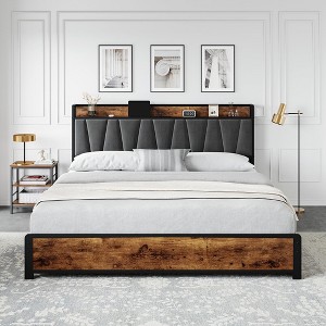 King Size Bed Frame with Storage Linen Upholstered Headboard, 4 Drawers Platform Bed Frame with Charging Station, No Box Spring Needed, Easy Assembly, Vintage Brown
