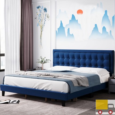 King Size Button Tufted Platform Bed Frame, Linen Upholstered Bed Frame with Adjustable Headboard, Wood Slat Support, Blue