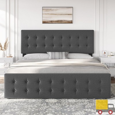 King Upholstered Platform Bed Frame with Storage Drawers & Solid Wood Slats - No Box Spring Needed, Grey