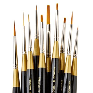 - Miniature Detail: These brushes were created for artists who use watercolor or acrylic paint. They feature golden taklon filaments mounted onto comfort grip handles. Their fine detail tips are good for creating tiny details and offer lots of control.