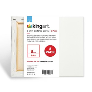 Our stretched canvas is the perfect choice for all paint applications, studies, and class projects. Primed with 9 oz. of acid-free acrylic titanium gesso. Our surface is ready to use for acrylic paint, oil paint, and other wet or dry media. Pre-Primed Canvas Pack – 6" x 6" canvases with three coats of animal-friendly, acid-free titanium acrylic gesso Perfectly Textured - Smooth, 100% cotton surface with enough grain for paint to hang from Sturdy & Reliable - Durable pinewood stretcher bar holds your canvas firmly Wet & Dry Media - Versatile and designed for a variety of paints and techniques Cotton Surface Ideal for Many Types of Media: - The stretched canvas can be used with a wide variety of artist media, from oil and acrylic to watercolor, ink, tempera, and gouache. Ready to Create - Each large stretched canvas in this set is pre-coated with 8 oz. of acid-free acrylic gesso. Start painting and creating as soon as you remove the wrapper. The KINGART® Heritage Our family has been exceeding the needs of the most demanding artists and enthusiasts for three generations. We delight in challenging the status quo and putting our experience to work for you.
