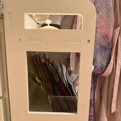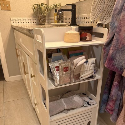 It’s plastic wood, incredibly light, but very soft material, like a styrofoam type of wood. Definitely not for heavy use. I plan on using it for lighter objects, like face masks, towels, tissues. Anything heavier than 5 lbs per shelf would make me worried. Other than that, it’s the perfect dimension, easy to put together, and looks good from a distance. It would not be a statement piece, but is functional and attractive for its place in my bathroom. Not necessarily flimsy, but a bit more delicate of a piece of furniture. See photos.
