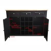 - Introduce a blend of sophistication and practicality with this black finish wine rack buffet server - Its sleek design enhances the aesthetics of your space, while the wine cabinets store up to 12 bottles, keeping your collection organized. The beautifully crafted raised panel doors and drawers offer extra storage, making it a perfect addition to any stylish home.
