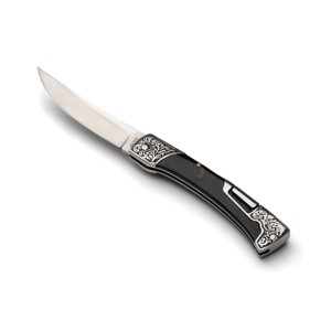 - The camping knife features a sleek handle made from resin-impregnated wood with delicate curlicue scrollwork on the stainless steel bolsters