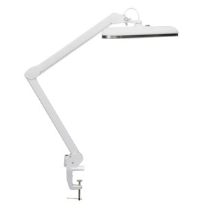 - This white lamp has a double-hinged arm with 360-degree rotation and a flexible 180-degree head that is lockable in any position allowing you to focus light right where you need it