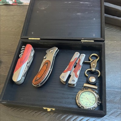 - Dimensions: Pocket Knife Overall: (L) 6”, Blade: (L) 2.25” x (W) 0.06”; Tool Kit Includes Multitool, 2 Pocket Knives, Belt Watch, and Wooden Gift Box
