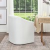 Refresh your dining room into a polished gathering space with our Performance Fabric Upholstered Barrel Back Rolling Dining Armchair, which is a perfect blend of elegance, comfort, and functionality. With its body-hugging curved back, gently sloping arms and waterfall seat, this fully upholstered dining armchair creates an elegant and inviting embrace. It cradles your body and provides optimal support, making it perfect for daily dining venues or occasional entertaining. With its graceful silhouette, harmonious proportions, and smooth surfaces, it floats atop caster wheels. This lets the chair glide so that you can join any conversation effortlessly around the table or in the kitchen behind you. Designed with your utmost comfort in mind, the spacious seat is meticulously crafted with high-density foam. Sink into its plush embrace and experience a truly blissful seating experience.