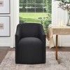 Refresh your dining room into a polished gathering space with our Performance Fabric Upholstered Barrel Back Rolling Dining Armchair, which is a perfect blend of elegance, comfort, and functionality. With its body-hugging curved back, gently sloping arms and waterfall seat, this fully upholstered dining armchair creates an elegant and inviting embrace. It cradles your body and provides optimal support, making it perfect for daily dining venues or occasional entertaining. With its graceful silhouette, harmonious proportions, and smooth surfaces, it floats atop caster wheels. This lets the chair glide so that you can join any conversation effortlessly around the table or in the kitchen behind you. Designed with your utmost comfort in mind, the spacious seat is meticulously crafted with high-density foam. Sink into its plush embrace and experience a truly blissful seating experience.