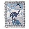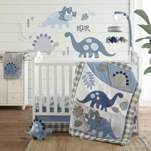 - ADORABLE DINOSAURS THEME: You will think you are a dinosaur adventure with our adorable prehistoric look. The fitted sheet is toss of cute dinosaurs, or switch it out with the one featuring . The quilt features appliqued, embroidered dinosaurs and leaves. The bedskirt has pieced blue with grey check, while the large nursery wall decal depicts a variety ofdinosaurs and plant leaves, completing your prehistoric nursery look.