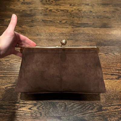 [This review was collected as part of a promotion.] I don’t love the look of this purse in person. It’s much larger than I expected when this looks like it should be a small, dainty clutch for a nice event. The gold clasp is large and needs a little effort to open and close. There is a leather strap to add if you want to carry it over your shoulder instead of as a clutch and I do appreciate that it has a small pocket inside