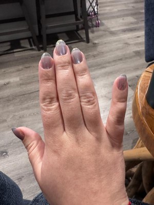 [This review was collected as part of a promotion.] I think everybody knows the brand #1 artificial nail brand KISS® nails… so, naturally, I expected these nails to be high-quality. I thought I was receiving the short blue round style. I received the purple. I didn’t want to completely ruin my natural nails.. so I first added a very thin layer of a cured UV foundation gel, to add as a barrier to my natural nail & the nail glue/artificial nail. It was hard for me to find the right fit for my nails. esp. my ring finger, so I had to use a nail from an old set that happened to match—which you can see in my pics I submitted.) before I was even able to apply the fake nail, I tried to buff down the edges of one of the nails and it cracked the KISS nail! Then about half of the KISS nails cracked as I was gently holding down the glued KISS nail onto my real nail (you can see the cracks in my middle + thumb fingy’s in my pic) It was really disappointing. They didn’t even last 1 day before popping off. (It’s been 2 days since I applied them and have had to glue 2 back on & there are currently 2 MIA. Sadly, I definitely will not be purchasing these nails anytime soon. This is unfortunate because the ‘magnetic cat eye/chrome’ effect IS really pretty. I love it, it looks very cool.. but the quality of these artificial nails have seriously declined. (…like most of everything this day & age. I swear everything is made like $#!+ on purpose!)