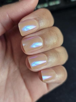 [This review was collected as part of a promotion.] This is a great pinkish nude color.. sometimes even looking slightly lilac. In comparison to the other colors in the ColorFX line it is subtle... not nearly as shimmery, prismatic, or color changing. This is a good everyday pinkish-nude with a twist. There's a subtle blue/purple/green chrome reflection in the light- VERY subtle. You can see the shrine effect in my photos.