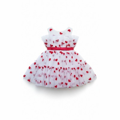- Sleeveless tulle dress with sheer shoulders, gathered tulle bodice, all-over felt heart pattern, and red satin belted waist; zip in the back