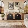 Warm farmhouse character meets everyday utility in this 63-inch buffet sideboard. Fluted doors, gold metal pulls, and a graceful arch base lend an elevated look that pairs easily with coastal or modern d¨¦cor. Inside, adjustable shelves store dinnerware, pantry staples, or small appliances, while the wide top accommodates a coffee station, microwave, or favorite accents. Crafted from sturdy, weight-bearing engineered wood with a reinforced frame, it anchors dining rooms, kitchens, or entryways with ample hidden storage and style. Illustrated instructions guide a straightforward assembly.