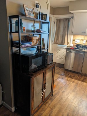 - [Sturdy and Safe] Constructed of high-grade engineered wood and thickened metal frame, this rustic microwave stand is long-lasting for your daily. The capacity of up to 150 lbs is enough to support coffee makers or large microwave ovens