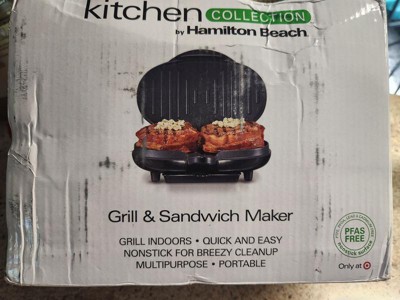 Fire up the grill — right on your countertop. A few minutes is all it takes to grill burgers, paninis, breakfast sandwiches and more with the Kitchen Collection™ Grill & Sandwich Maker. Enjoy your favorite grilled foods with delicious flavor and grill marks anytime — indoors, without taking up a lot of space on the countertop. It’s got 32 square inches of PFAS-free nonstick coated grilling surface so it can cook up to two burgers at once. Just plug it in and a few minutes later you’re grilling up your faves — and since the lid closes for faster cooking on both sides at the same time, they’re done in a snap. Cleanup is easy too. The drip tray pulls out for easy draining and can then go on the top rack of the dishwasher. The durable, PFAS-free nonstick coated grilling surface is simple to clean with a damp cloth once it has cooled. And its compact size makes it easy to stow away in a cabinet. All this and less fat, since the drip tray catches grease and drippings which fall away from the grill. Carry it anywhere — it’s under 1.72 lbs.! From Hamilton Beach, trusted since 1910.