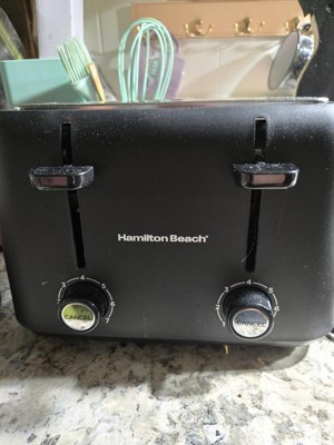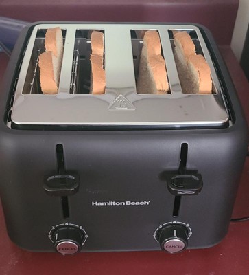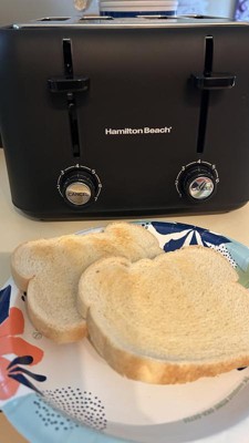 [This review was collected as part of a promotion.] Hamilton Beach 4 Slice Toaster Some of the things I love about this toaster: * 4 slice toaster with wide slots for different breads/bagels * 7 different shade selector on each side to accommodate different tastes * a long 3 foot cord! * evenly toasted on both sides * cool to the touch on the outside * a beautiful compact design This toaster looks beautiful on my counter and it's compact size doesn't take up much room. The wide slots are perfect for all types of bread and bagels, which I love. My husband likes his toast darker than I do, and with the selector on each side makes it possible to toast at the same time. As you can see in the picture, the top pieces of toast were on level 4. The bottom pieces were at level 3. There's also a cancel button if you need to stop the toaster sooner. The bread toasts evenly on both sides, and the toaster stayed cool to the touch on the outside. The long cord makes it possible to pull the toaster out from under cupboards if needed, with cord to spare. I can't say enough good things about this toaster, and I highly recommend!