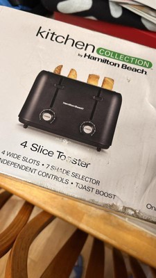 [This review was collected as part of a promotion.] The Hamilton Beach Kitchen Collection 4-Slice Toaster is a good product with all the features I find necessary in a toaster. Most important are the extra-wide slots. There is nothing worse than having to stuff something into a toaster. Not with this one. Plenty of space for thick bagels. Building on that feature, the Toast Boost makes sure you don't have to go digging around in the slot to remove what you have toasted. It has seven shade settings to get the right amount of toasting. I like the cord wrap at the bottom of the toaster for easy storage. The exterior of the product has a great finish that resists fingerprints and smudges, so it stays clean with little effort. This is exactly what I expect out of a toaster and for that reason, I highly recommend it.