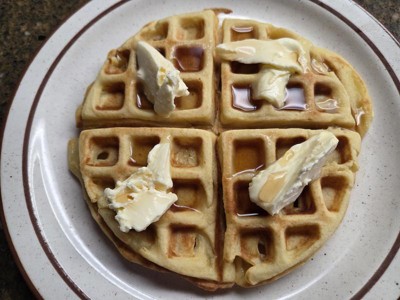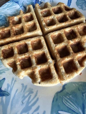 A: It’s the size of my hand at least 6 to 6.5 inches sorry I don’t have a ruler but about that size I’d say maybe even 7 inches but more than likely 6.5. And it makes the waffles perfect texture slightly crispy on outside and super fluffy on inside.