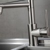 Brushed nickel kitchen faucet with pull-down sprayer, stainless steel body, single handle lever for smooth control.