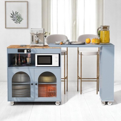 This 53-inch rolling kitchen island offers an ideal combination of countertop workspace, concealed storage, and power access. Designed with a foldable drop leaf, internal door racks, and a built-in power station, it enhances both efficiency and aesthetics. Whether used as a prep station, dining cart, or storage center, this island brings modern functionality and timeless style to your kitchen or dining area.