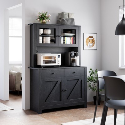 Kitchen Pantry Cabinet with Microwave Countertop, Freestanding Hutch Cabinet with Adjustable Shelves, 6 Doors, 1 Drawer, UV Painted MDF Storage Unit