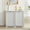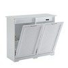 This space-saving kitchen trash cabinet keeps your garbage concealed and odor-free with its integrated deodorizer and air purifier. The dual-bin tilt-out drawer design accommodates 2 10-gallon trash receptacles side-by-side, perfect for separating recyclables. Constructed from durable white MDF wood, this cabinet mounts to the wall for a clean, integrated look. The flat countertop provides extra storage for appliances, decor and pet food. With its pet proof doors and easy installation, this is the perfect kitchen garbage can cabinet solution for any home.