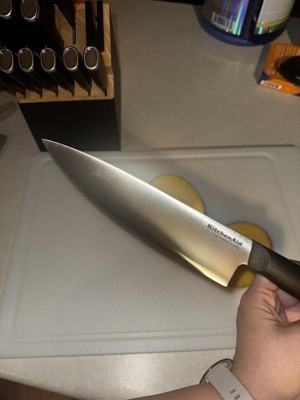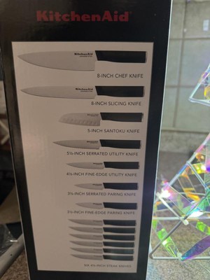 - KITCHEN ESSENTIAL: This KitchenAid 14-piece knife block set includes an 8-inch chef knife, 8-inch slicer knife, 5.5-inch serrated utility knife, 5-inch Santoku knife, 4.5-inch fine edge utility knife, 3.5-inch parer knife, 3.5-inch serrated parer knife, six 4.5-inch steak knives, and a two-tone knife block with built-in sharpener.