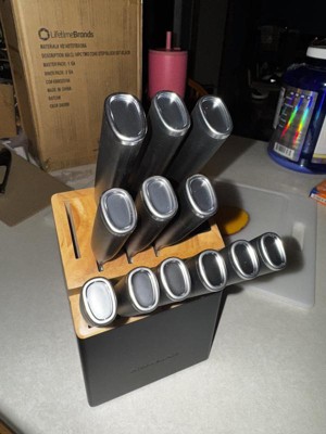 Includes: Knife Block, Steak Knives, 2 Utility Knives, Slicer, Chef Knife, Paring Knife, Santoku Knife