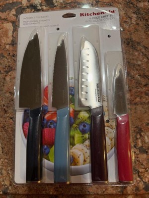 Great set of KitchenAid 4pc Chef Knife Set for everyday food prep tasks such as slicing, cutting, chopping, mincing, trimming, and more. Easy to use and to handle with comfortable nonslip material. Each knife comes with it’s protective blade cover. Awesome quality material and very durable. Love them!
