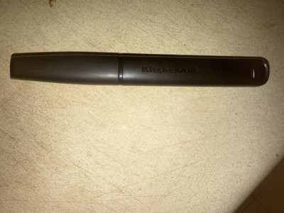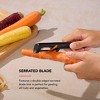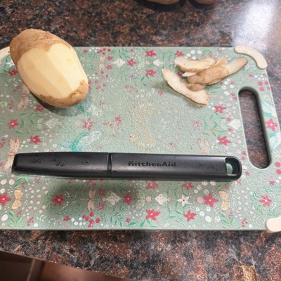 The KitchenAid Vegetable Peeler features a double-edged serrated blade, making it the ideal tool for peeling all fruits and vegetables, including soft-skinned produce. The peeler comes with a protective plastic blade cover. The ergonomic handle is perfectly weighted for optimal comfort, balance and control, giving it a premium feel in your hand. Highly durable, the sturdy construction stands up to everyday use. Dishwasher safe.