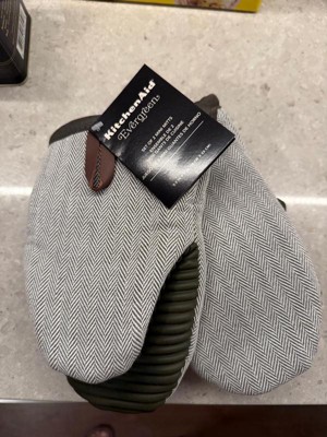 KitchenAid® Evergreen Design Series Herringbone Ribbed Soft Silicone Mini Oven Mitts provide a secure, non-slip grip while safeguarding your hands from heat up to 500 degrees Fahrenheit. Featuring flexible, molded ribbed silicone palms and a thick, 100% cotton herringbone-textured lining, these mini oven mitts combine style and functionality. The thick diamond terrycloth lining and leather loops enhance both usability and storage. The waterproof silicone ensures easy rinsing for long-lasting durability.