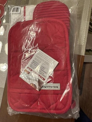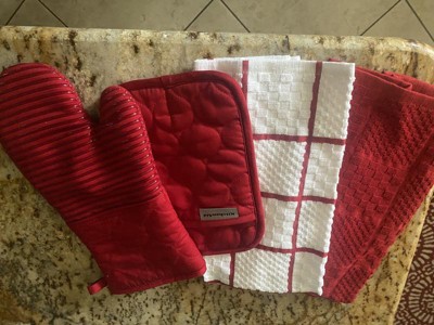 [This review was collected as part of a promotion.] I absolutely love this KitchenAid towel set, oven mitt and potholder. The red shade is so bright and pretty it goes so well in my kitchen. The set is great quality and I love the plastic grips on the potholder and oven mitt.