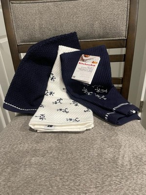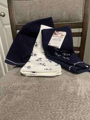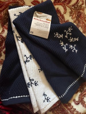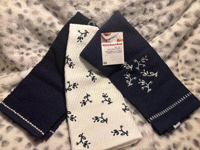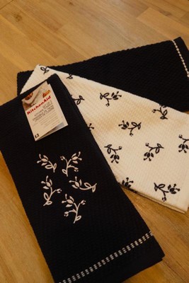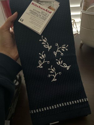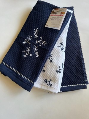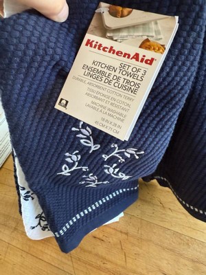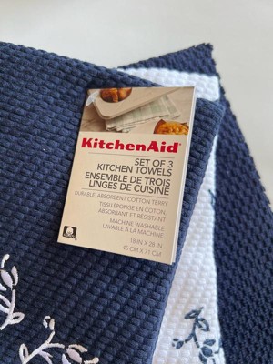 KITCHENAID Vintage Florals Collector Series Embroidered Kitchen Towel 3-Pack Set, Absorbent 100% Cotton, Dual-Purpose, Ink Blue, 18"x28"