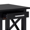 Handcrafted with care using the finest quality solid woodHand-finished with a Black Finish and a protective NC lacquerMultipurpose table can be used as an end table or side table. Looks great in your living room, great room, condo or bedroomFeatures one large drawer with metal drawer glides and an open bottom shelf providing ample storage space.Contemporary style includes a square edged table, Brushed Nickel pulls, X design detail and square legsAssembly Required