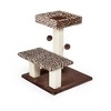 Prevue Pet Products Kitty Power Paws Leopard Terrace 7300 combines super soft, plush fabrics with durable jute to provide the perfect place for lounging, sleeping, scratching and playing. A luxurious leopard print bolstered day bed is a great spot for your kitten or cat to survey its surroundings or take a cat nap. Two plush, dangling, swat toys hang playfully from the cat bed while the natural jute rope scratching posts offer an appealing texture to cats, curbing inappropriate scratching behaviors. An additional platform provides opportunities for pouncing and jumping or enough vertical space for two cats to lounge comfortably. Covered in a luxe leopard print, our Leopard Terrace cat tree has been expertly designed for easy assembly and to satisfy the needs of cats of all ages, sizes and activity levels. Measures 20 1/2" Long, 17 1/2" Wide and 21" High.
