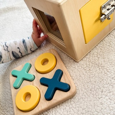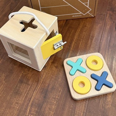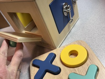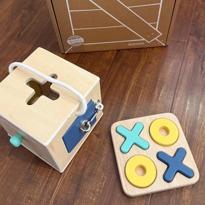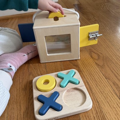 By far our favorite product from KiwiCo for my 11 month old. Although she hasn’t figured out the locking mechanism just yet, she truly enjoys inserting the Xs and Os in the box and discovering where they are again.