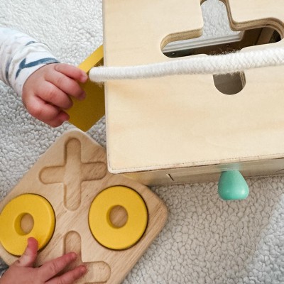 Puzzle it out with KiwiCo Sort & Solve! Stretch problem-solving skills with the Play-and-Go Lockbox. It has three different puzzle doors to open and close and comes with a grownup guide for extra play ideas. The included XOXO puzzle pieces can slide through the slot on the lockbox or fit in their own wooden frame — giving toddlers plenty of tactile play options. Designed to pass the Let’s Do It Again! Test, the lockbox also features a sturdy rope handle for little hands to carry it along on all their adventures. It’s a treasure trove of puzzling possibilities!