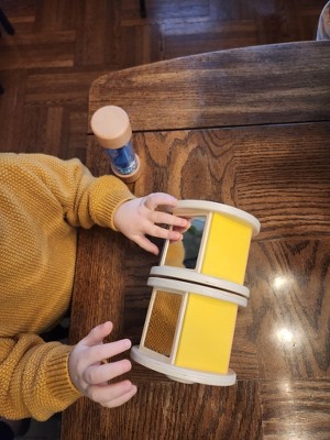 Experiment with sight, sound, and touch with KiwiCo Listen & Learn! March to the beat of the double spinning drum, a sensory-rich toy that will captivate babies and toddlers alike. Colors, mirrors, two different sounds, and a grownup guide offer many ways to play. Add the included solid-wood waterfall shaker and you’ll have the makings of a music festival in your own home!