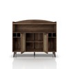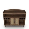 With a retro touch and a distressed walnut finish, this buffet server is the perfect furniture piece for a Midcentury style home. Place this buffet in your dining room to hold all your serveware and barware, complete with several open shelves, a center cabinet, and 6-bottle cubbies. Extra details such as flared and tapered legs and woven cane door fronts further lend to the vintage look.