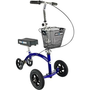 KNEEROVER HYBRID KNEE SCOOTERThe Most Trusted Mobility Solution from the # 1 Knee Walker Brand KneeRover has been designing and developing superior, high quality knee scooter products in the USA for over 10 years. We are proud to have helped hundreds of thousands of customers recover with more mobility freedom. The KneeRover HYBRID is the first knee scooter to feature All Terrain Pneumatic Front wheels in a four wheel design for maximum freedom and stabilityen leg, foot surgery, ankle surgery or other lower leg injuries or medical conditions like ulcers.Advanced steerable knee scooter features automotive style tie-rod steering mechanism, an adjustable locking handbrake and rear drum brake for maximum stability and control. Premium indoor - outdoor knee walker features air filled 9 inch front tires and smooth 7.5 inch PU rear wheels with shock-absorbing sealed windows. Compatible with both the right and left legs, the Knee Rover Hybrid kneeling scooter offers a 3 inch thick contoured knee platform and ergonomic rubber hand grips for complete comfort. The Hybrid Knee Scooter is lightweight and portable thanks to its simple folding mechanism that utilizes an easy to use thumb-release lever. Additionally, these knee walkers are equipped with a free detachable storage basket. Specifications: Color: Blue Product Weight: 25.6 lbs Weight Capacity: 300 lbsOverall Length: 30" Handlebar Height Range: 34.5" to 41.5" Overall Height w/ handlebar folded: 17.5"< Knee Support Height Range: 16" 22.5" Knee Pad: 7" width x 12.5" length Front Axle Width: 20" Rear Drum Brakes Basket Included: 12 x 8 x 8.5