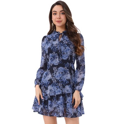 Knit & Lounge Women’s Floral Long Sleeve Dress Crew Neck Smocked Cuffs Tiered Skirt Casual Fall Mini Dress - 1 of 4