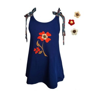 Flower fabulous and fun! This top is interactive and comes with 3 interchangeable yarn hair accessory flowers that attach to top. Graphic on top becomes 3D when flower is applied. Hair accessory yarn flowers look so pretty in the hair and on graphic top. Allows a young girl to mix, match and attach creating the look she likes. Floral fabric shoulder ties complete this fun and fashionable look.