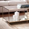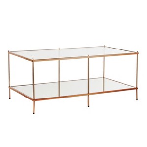 Hollywood sophistication swings to life in this elegant cocktail table. Shimmering mirrored shelf shows off tchotchkes, conversation starters, or board games, while sleek glass tabletop displays flower arrangements and coffee table books. Reflect glamorous style with this metallic copper cocktail table in a living room, formal parlor, or entryway.